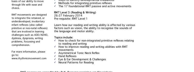 This 2-day course focuses on how reading and writing ability is not just about doing it. They are affected by various factors such as our vision, our ability to recognise the sounds of the language and our motor ability. We learn how to check for non integrated primitive reflexes and recognize other motor disabilities that are important in reading difficulties and how to improve reading and writing ability by correcting these balances with Rhythmic Movement Training and reflex integration activities.
